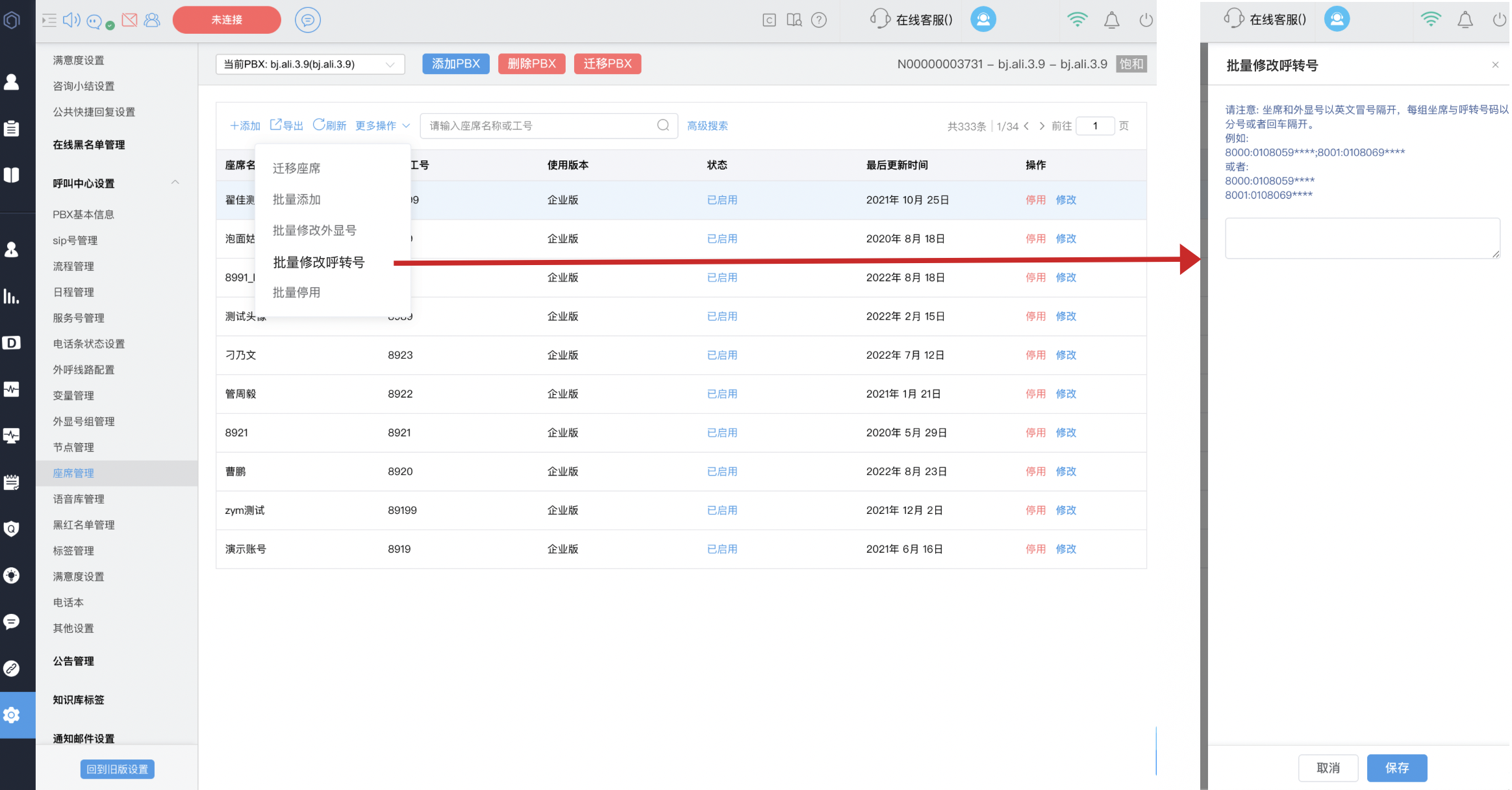 【新增】支持批量修改座席指定呼转号码: